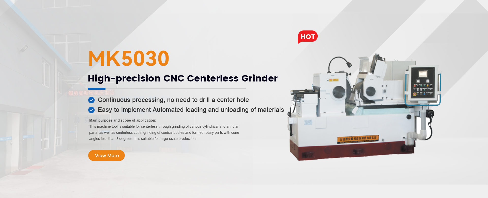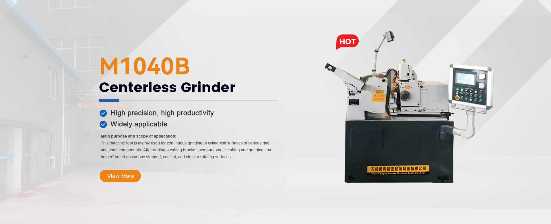 The grinding machines produced by the Company are widely applicable to the mass production of automobile, tractor, aerospace, instrument, bearing, tool, spinning machine and other industries. Ordinary centerless grinding machines have been put into the market: M1010B, M1040B, M1050A, M1080B, M1083B, M101000, etc; In addition, high-precision CNC centerless grinding machines: MK1040S, MK5020, MK5030, MK0100, and wide grinding wheel CNC centerless grinding machines: MK11100, MK10200, MK11200, MK11250, MK11250. With stable and reliable product quality and excellent performance, the products are affirmed by users.